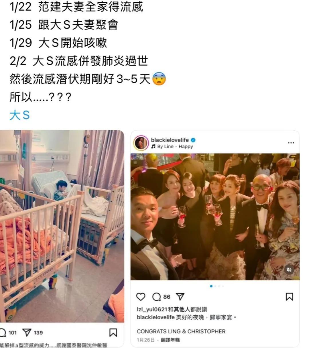 大S死讯传出后,有网友梳理她的社交账号发现,1月22日,她一家四口得了流感,还晒出了照片。同月25日,她出席王伟忠大女儿归宁宴,还跟大S等人聚会。5天后的1月29日,大S出现咳嗽症状,2月2日流感并发肺炎去世,享年48岁。
