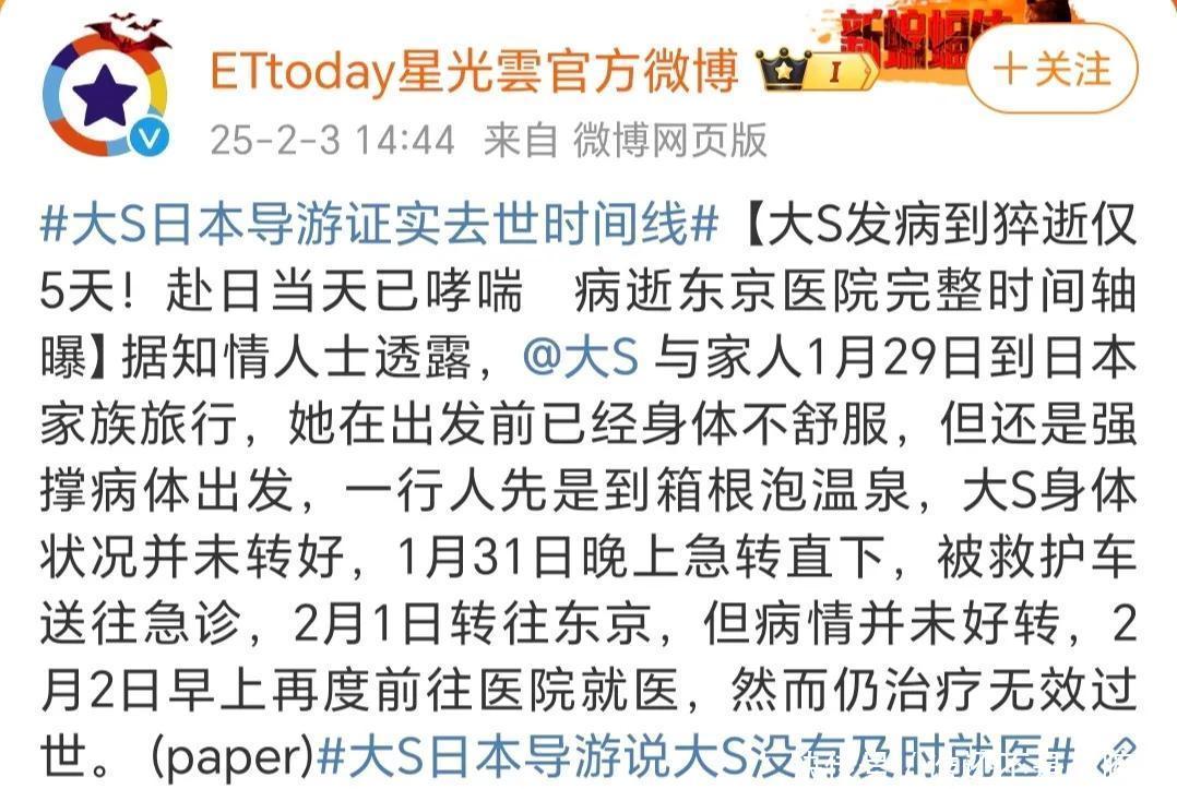 抵达日本后,她们一家去泡了温泉。大S的情况越发糟糕,第3天更是被送急诊救治,第五天,也就是2月2日早上抢救无效死亡。